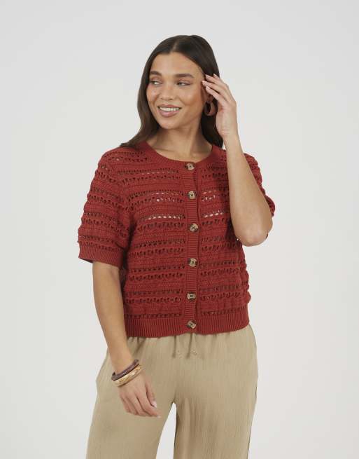 Brave Soul Short sleeve pointelle knit crew neck cardigan in amber