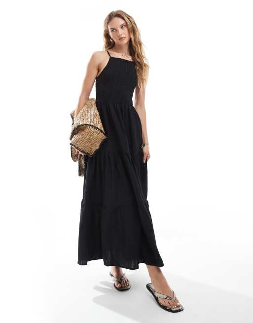 Brave Soul strappy tiered maxi dress with shirred bust in black
