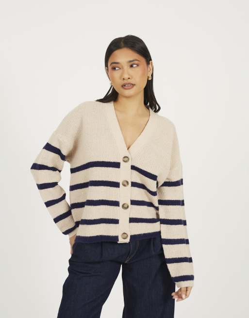 Brave Soul Stripe v-neck fisherman knit cardigan in light stone