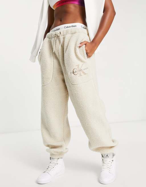 Calvin Klein Jeans logo sherpa joggers in eggshell