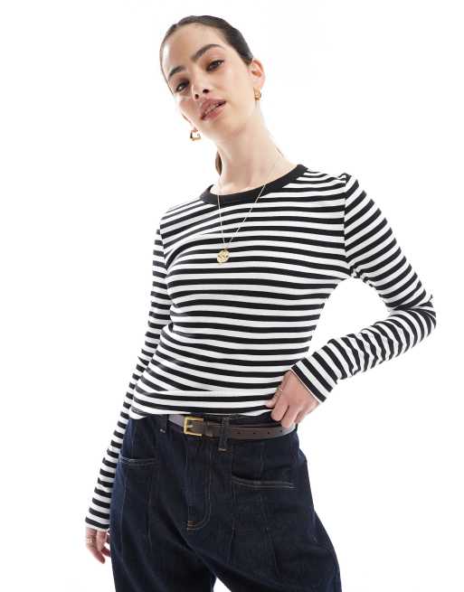 Calvin Klein Jeans woven label stripe long sleeve rib t-shirt in white & black