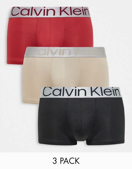 Calvin Klein 3-pack low rise trunks in black grey and red with contrast waistband