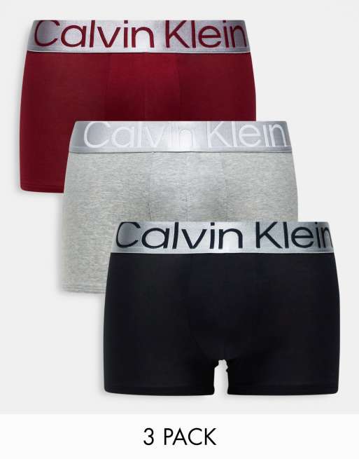 Calvin Klein 3-pack trunks in red, black and grey with silver waistband
