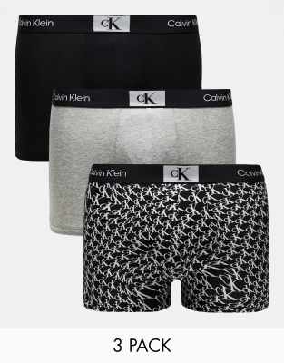 Calvin Klein CK 96 3-pack trunks in printed black, black and grey