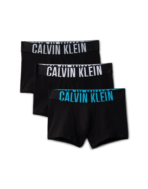 Calvin Klein Intense Power 3 pack trunks in black with blue/grey waistbands