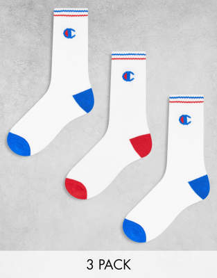 Champion 3 pack crew socks in white with red and blue