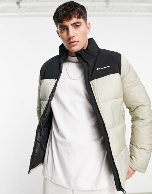Champion small logo puffer jacket in stone/ Black