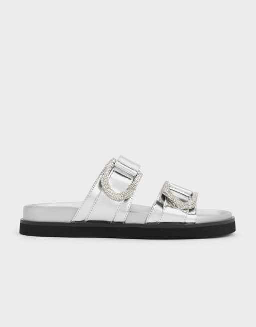 Charles & Keith Gabine crystal-embellished buckle metallic leather slides in silver