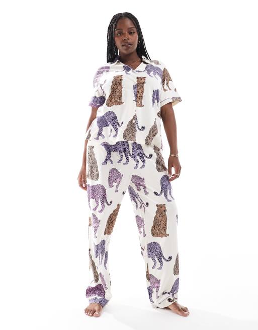Chelsea Peers Exclusive Curve cotton tonal leopard print button short sleeve top and trouser pyjama set in off white