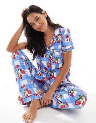 Chelsea Peers short sleeve revere and trouser pyjama set in berry picnic blanket print