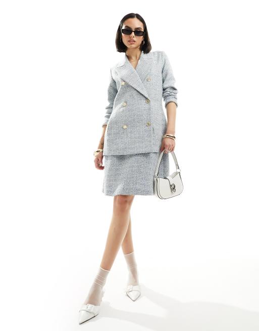 Closet London double breasted blazer in baby blue tweed check co-ord