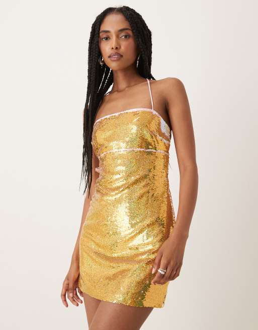 Collective The Label Lace-up back mini dress in gold pink sequin