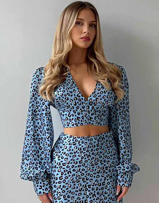 Collective The Label V-neck button front blouse in light blue leopard