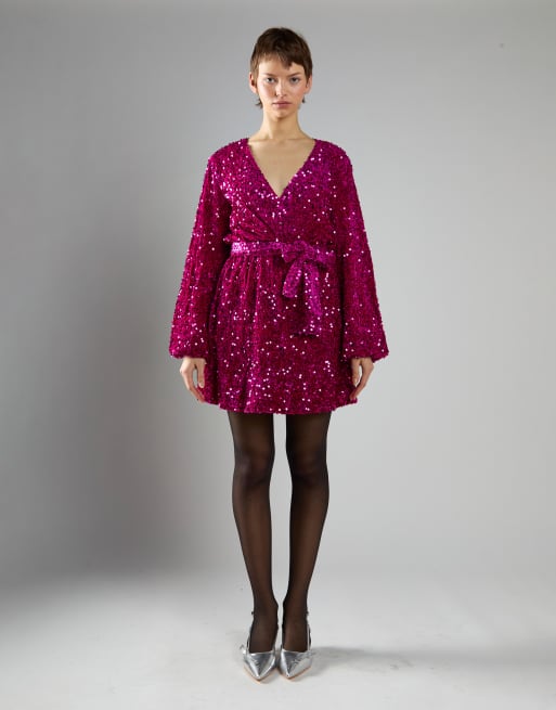 Collective The Label V neck wrap mini dress in cerise velvet sequin