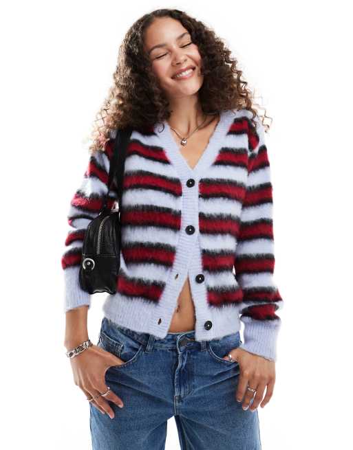 COLLUSION brushed stripe v-neck cardigan in red & blue