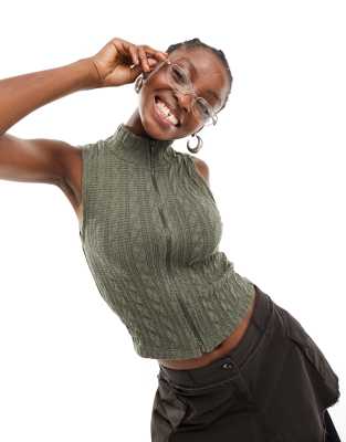 COLLUSION cable knit zip through funnel vest in khaki