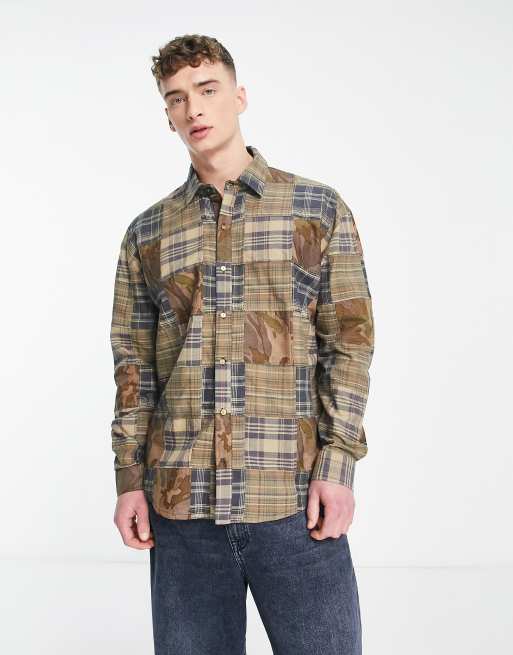 COLLUSION check & camo oversized patchwork shirt co-ord in khaki