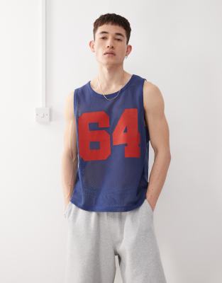 COLLUSION Crochet tank vest in blue with varsity number print