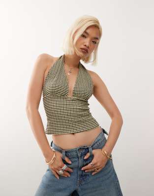 COLLUSION halter in lemon and black textured gingham