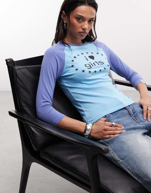 COLLUSION i love girls slogan 3/4 sleeve tee in blue