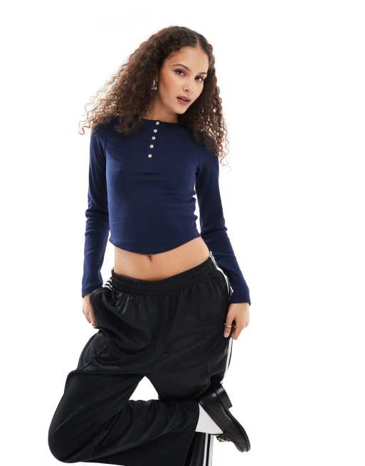 COLLUSION long sleeve shrunken waffle henley tee in navy