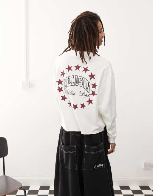 COLLUSION Long sleeve skater dept varsity t-shirt with back graphic in white