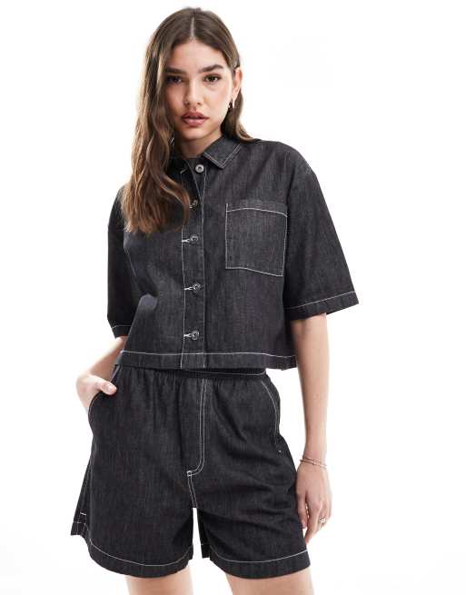 COLLUSION oversized short sleeve lightweight denim shirt with contrast stitch co-rd