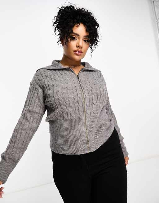 COLLUSION Plus cable knit oversized collar zip through jumper in grey marl
