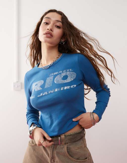 COLLUSION Rio print fitted long sleeve t-shirt in navy
