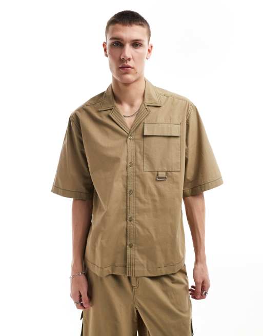 COLLUSION ripstop boxy revere shirt with contrast stitch co-ord in khaki
