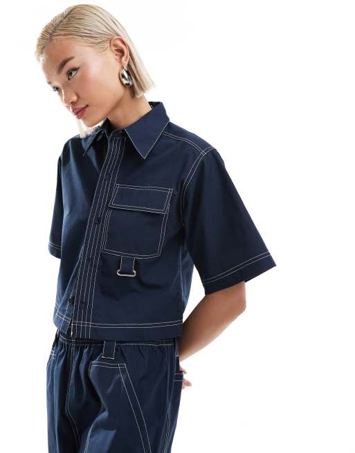 COLLUSION ripstop crop boxy shirt with contrast stitch in navy