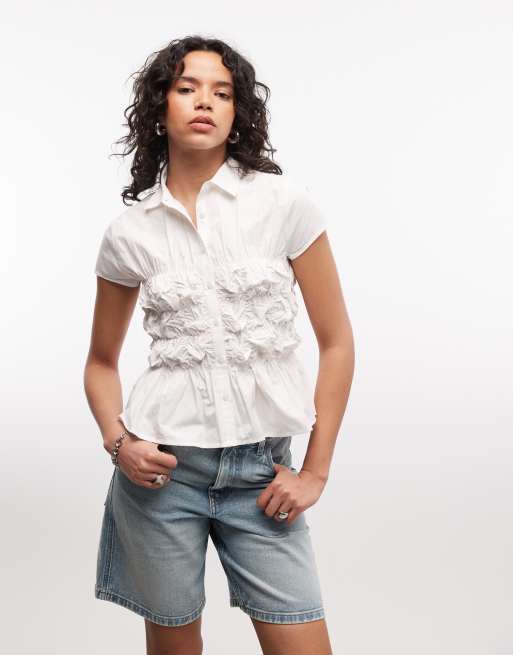 COLLUSION ruched fitted short sleeve shirt in white