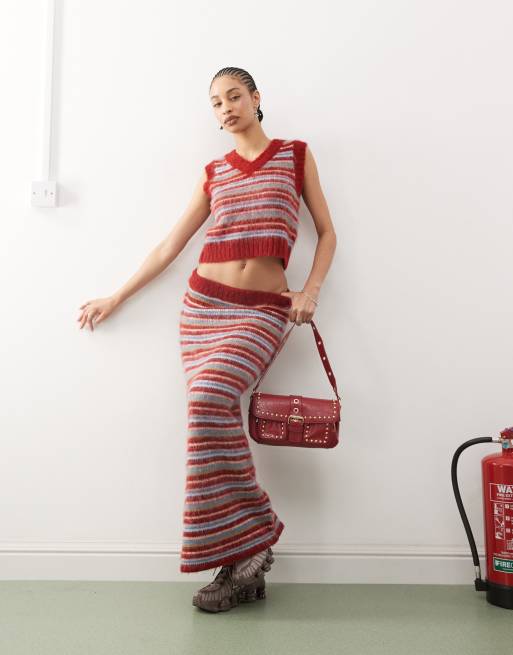 COLLUSION striped fluffy knitted maxi skirt in burgundy