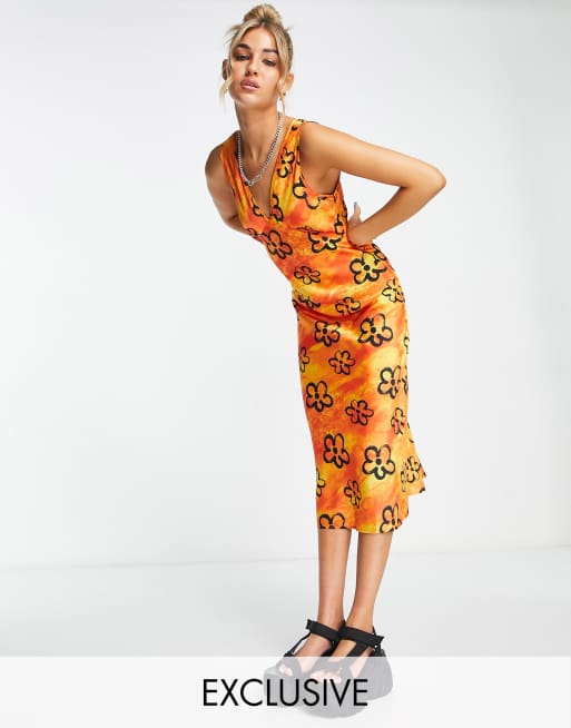 COLLUSION tie dye floral satin midi slip dress in orange print