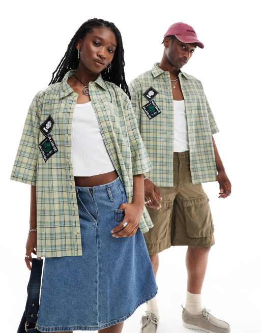 COLLUSION Unisex boxy skater shirt with skate badges in green check