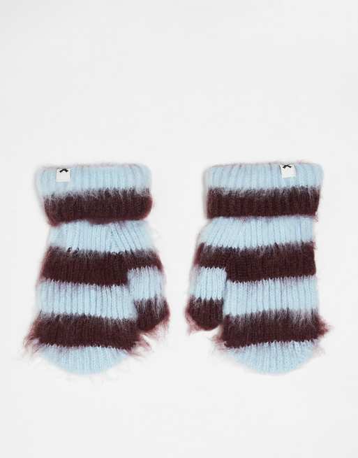 COLLUSION Unisex brushed mittens in blue & burgundy stripe