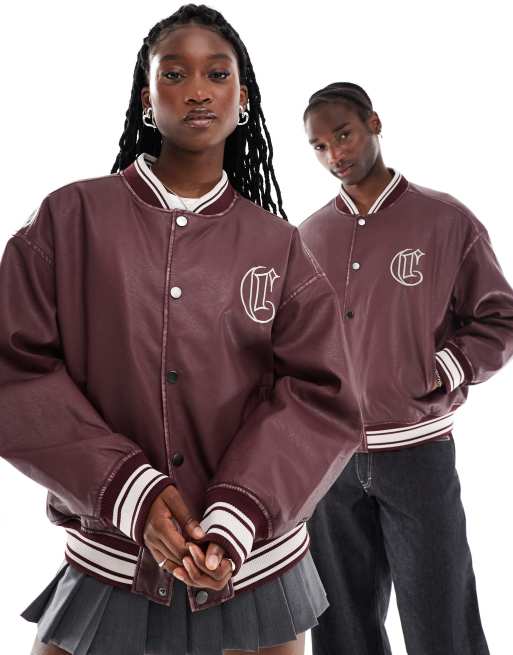 COLLUSION Unisex faux leather bomber jacket in burgundy