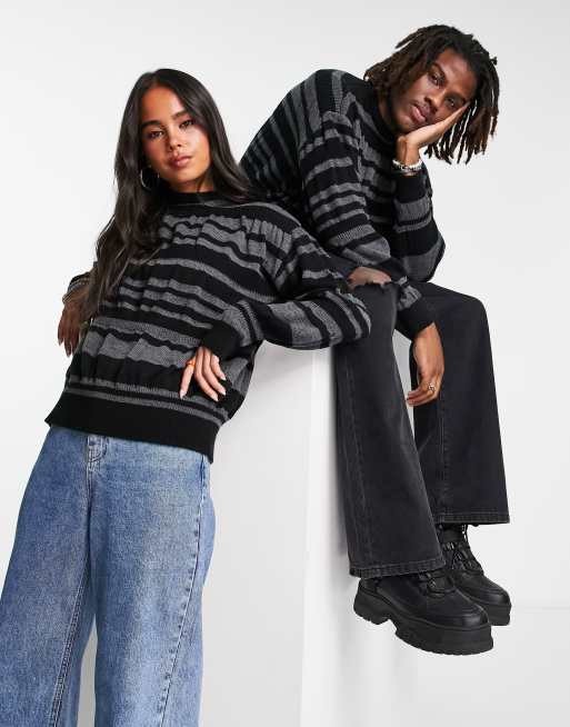 COLLUSION Unisex knitted stripe jumper with elastic detail in black and grey