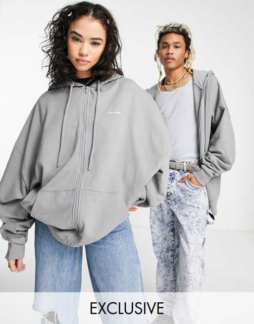 COLLUSION Unisex oversized heavyweight zip through hoodie with print in grey