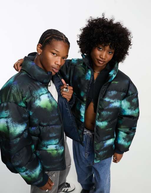 COLLUSION Unisex tie dye puffer coat in blue and black