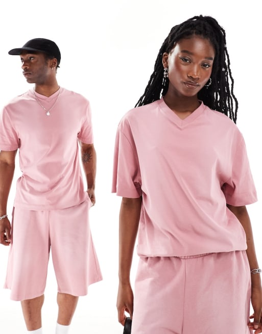 COLLUSION Unisex v neck skate t-shirt co-ord in washed pink