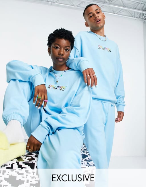 COLLUSION x EXIST LOUDLY Unisex joggers & sweatshirt with print in blue co-ord