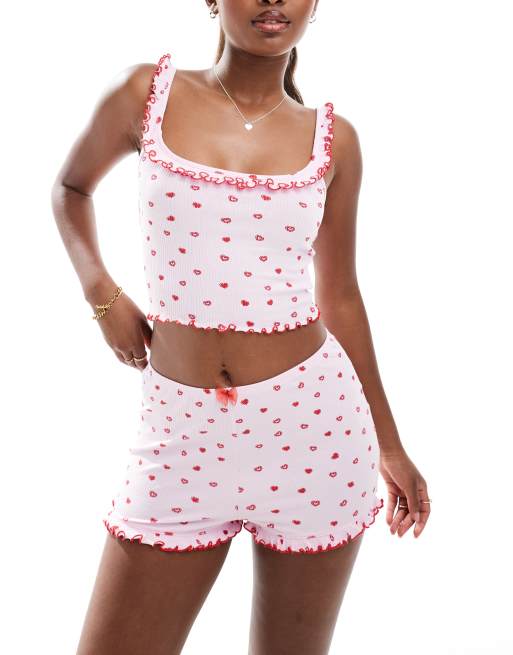 Cotton On heart print rib ruffle cami top in pink co-ord