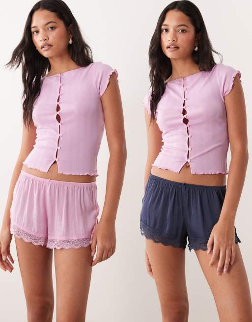 Cotton On sleep washed satin lace short set in pink and blue