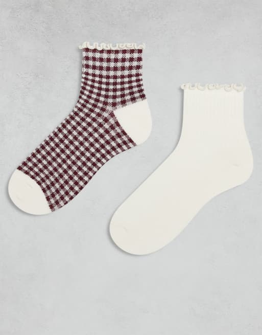 Cotton On 2 pack the perfect pair frill rib ankle sock in white and red gingham