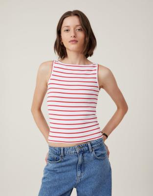 Cotton:On Staple rib boat neck tank in remi stripe white/fiery red