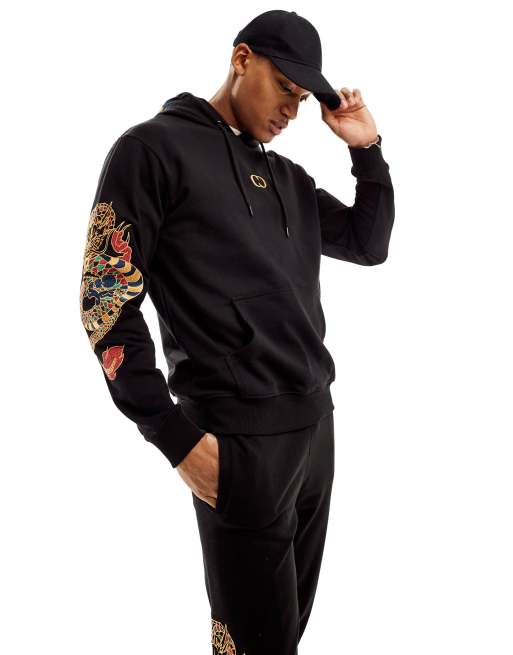 Criminal Damage dragon detail embriodery hoodie in black
