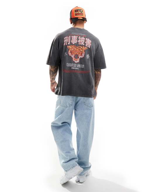 Criminal Damage oversized graphic t-shirt with front embriodery in black wash