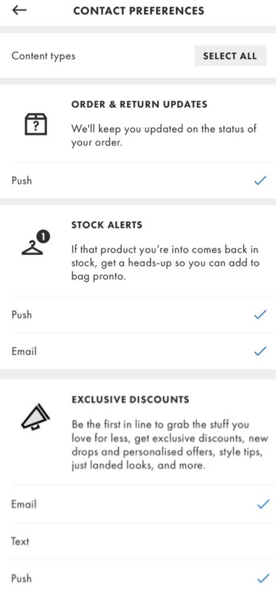 To do this, simply go to 'My Account' and select 'Notifications'. Once there, you'll be able to opt-in to receiving stock notifications, delivery and returns updates, and discounts and new drops to your phone. - Check your email address.