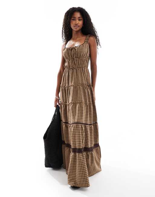 Daisy Street gingham check milkmaid midi dress in brown gingham